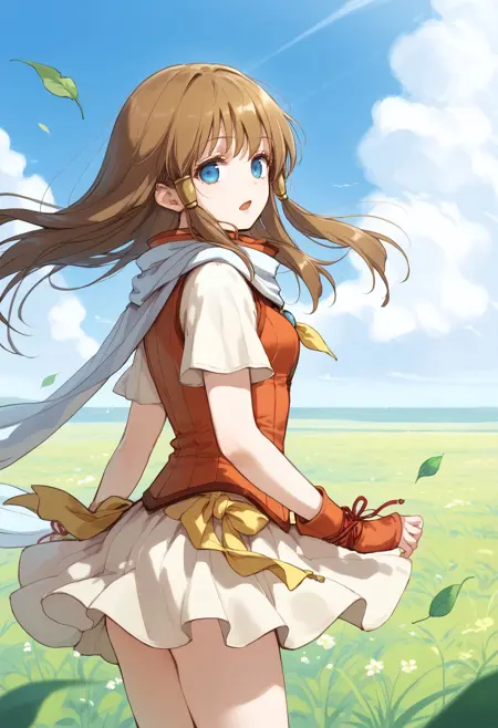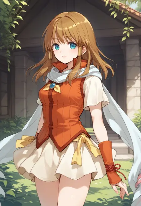 Add "scarf,brooch,fingerless gloves,shirt,skirt,socks,boots" for her typical look.