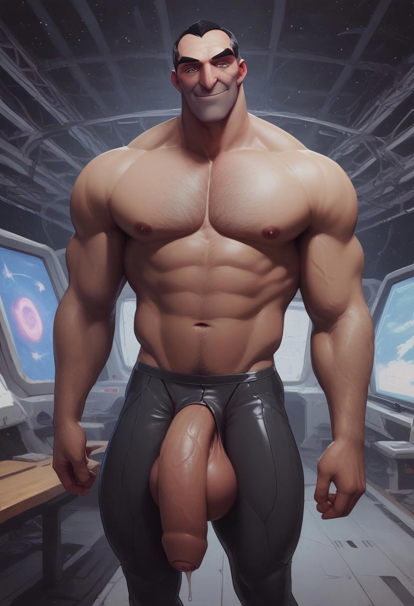 white skin, short black hair grey sides, bara, muscular old man