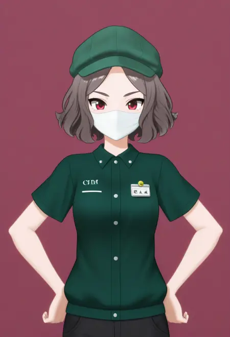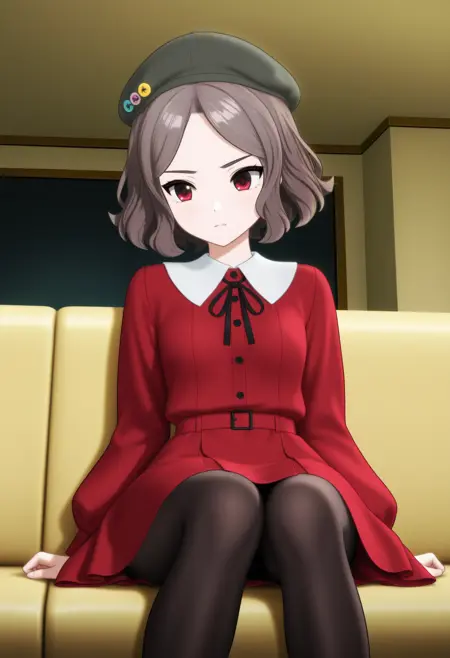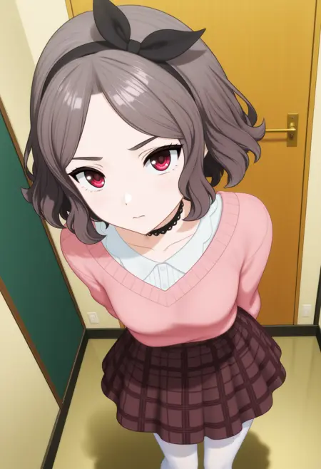 GBC_TOMO,red eyes,wavy hair,short hair,brown hair,