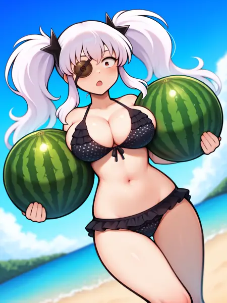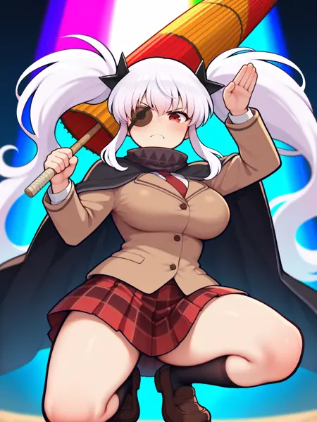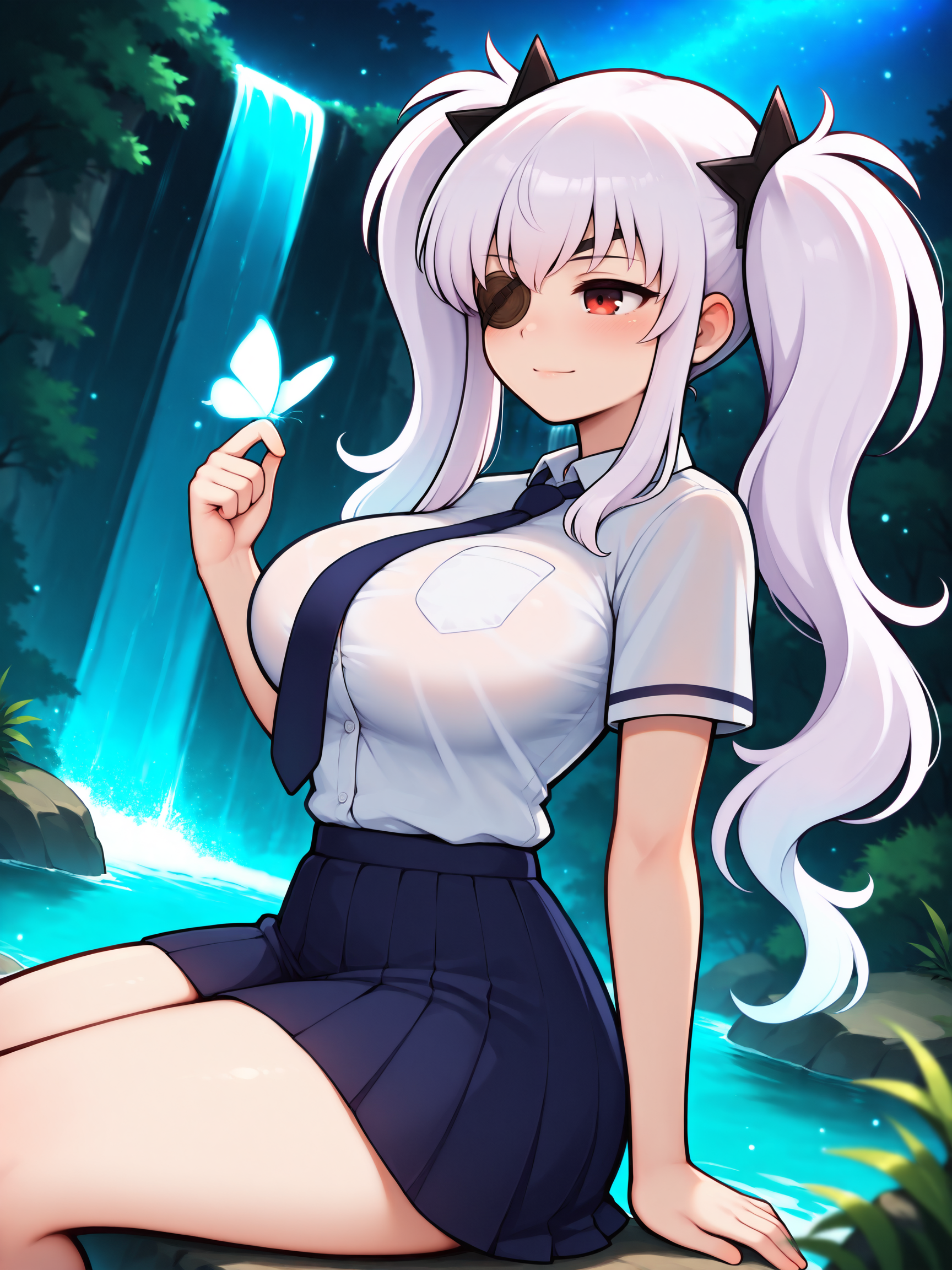 LoRAのトリガーワードは**"Yagyu_IL, 赤い目, 目帯, 白髪, 長髪, ツインテール, 手裏剣型の髪留め, 黒い髪留め, 大きな胸"**です。