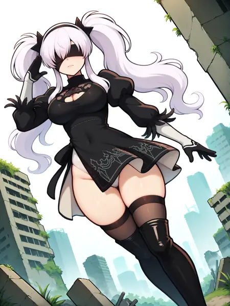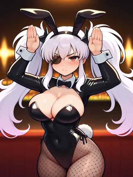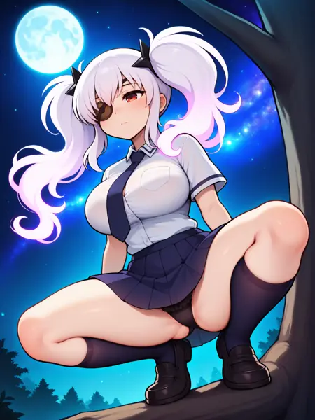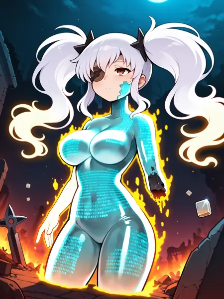LoRAのトリガーワードは**"Yagyu XL, 赤い目, 目帯, 白髪, 長髪, ツインテール, 手裏剣型の髪留め, 黒い髪留め, 大きな胸"**です。
