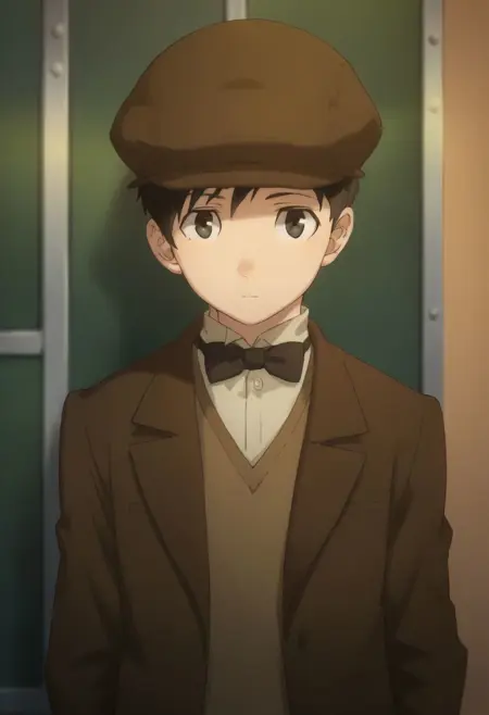 meyer, 1boy, male focus, hat, anime coloring, bow, bowtie, brown hair, jacket, black bow, brown jacket, pants,