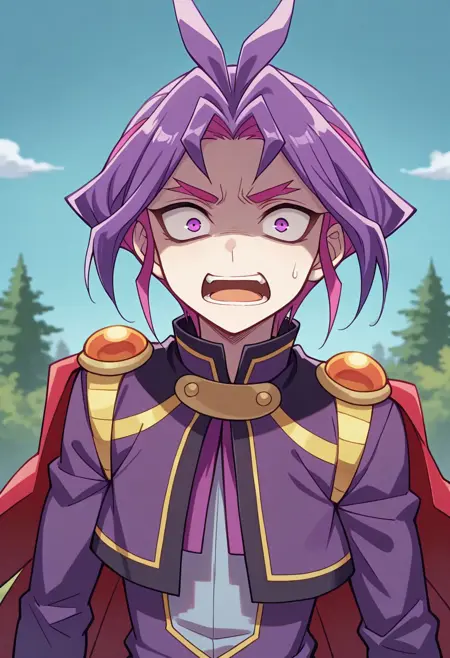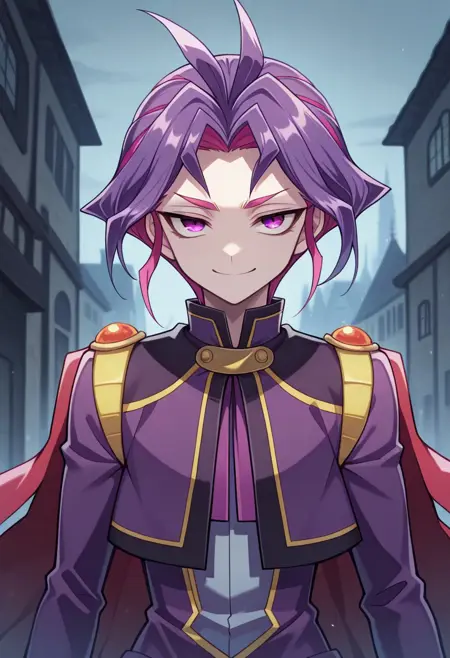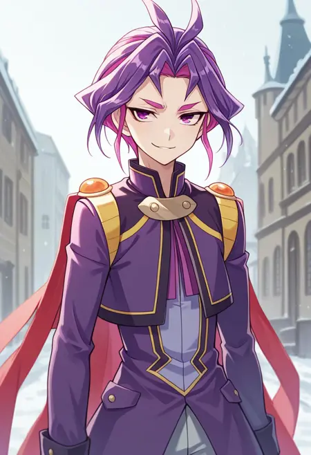 yuri_arc, 1boy, male focus, solo, purple hair, cape, boots, purple eyes, grey pants, antenna hair, long sleeves, smirk, two-tone hair, multicolored hair,