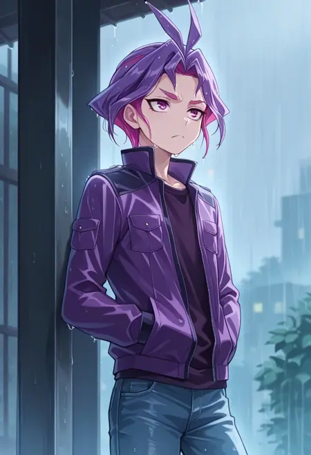 yuri_arc, 1boy, male focus, solo, purple eyes, multicolored hair, two-tone hair, antenna hair, purple hair, pink hair, shirt, purple shirt, coat, purple coat, long sleeves, cape, red cape, pants, grey pants, boots, grey footwear,