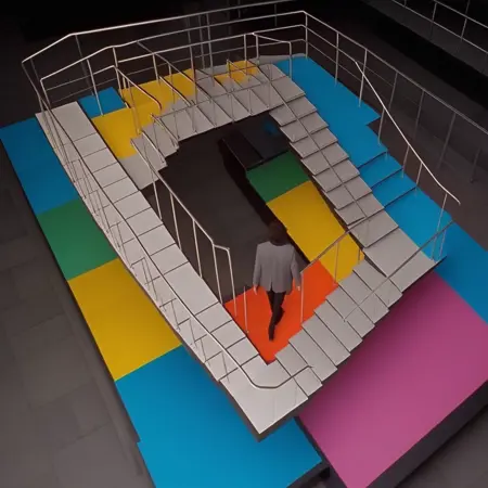 penrose_stairs, penrose steps, infinite looping stairs, impossible staircase, movie scene, steps suspended in air, brown color steps, railing, people walking on steps