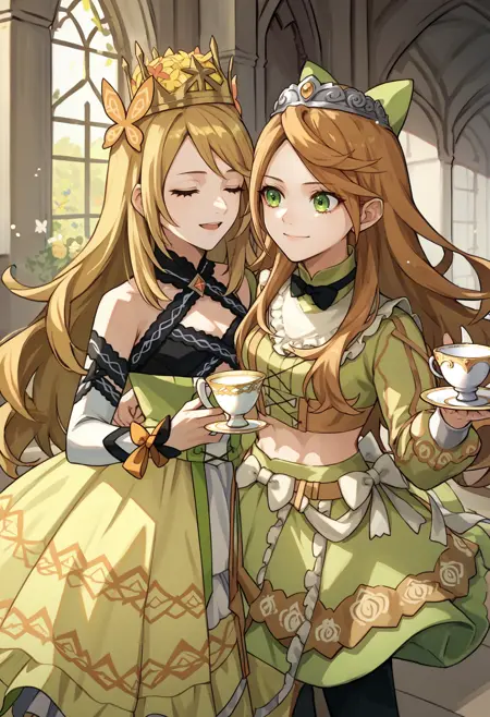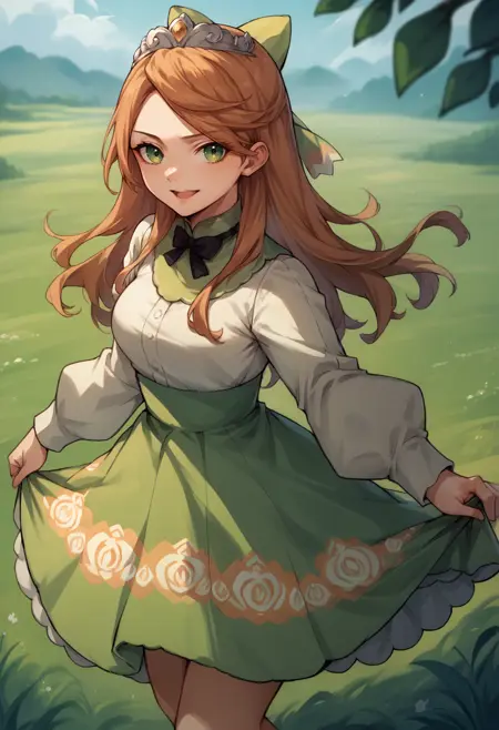 デフォルトの外見: defEtie、長い髪、髪のリボン、ティアラ、黒いボウタイ、グリーンのショートトップ、長袖、お腹の部分、グリーンのスカート、フリル、白いリボン、黒いパンツタイツ