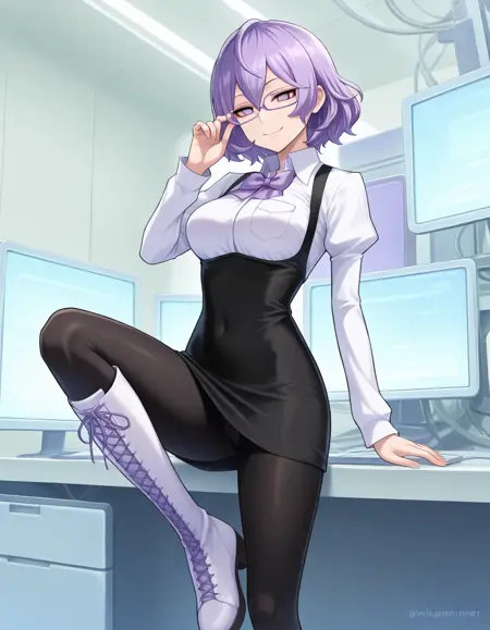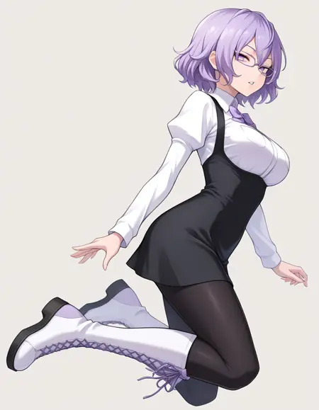 触发词:mikaguramirei, 紫色头发, 中长发, 紫色眼睛, 无瞳孔, 眼镜, 紫色眼镜