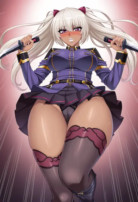 ユニフォーム: military uniform, pleated skirt, lace-trimmed thighhighs, high heel boots, thigh holster,