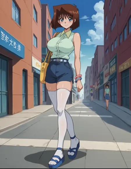 배틀 시티: 짙은 노랑색 칼라가 있는 밝은 녹색 민소매 버튼 셔츠, 파란색과 핑크색 팔찌, 네이비 블루 반바지, 밝은 파란색 벨트, 흰색 스타킹, 허벅지까지 긴 패션, 파란색 플랫폼 샌들