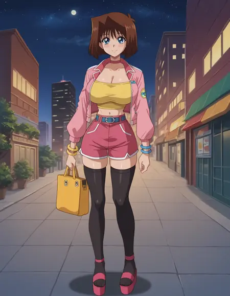 배틀 시티: 파란색과 핑크색 팔찌, 네 개의 팔찌, 노랑색 어깨 없는 튜브 탑, 핑크색 반바지, 파란색 벨트, 빨간색 플랫폼 샌들, 핑크색 초이, 검은색 허벅지 스타킹, 시선을 향함, 배꼽, 핑크색 자켓, 노랑색 가방