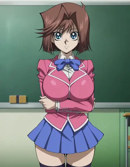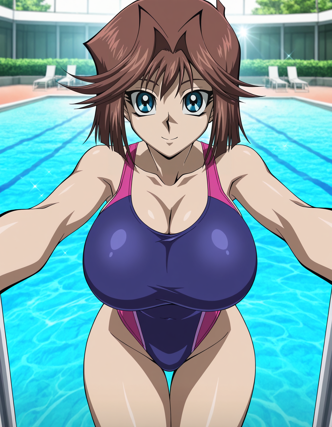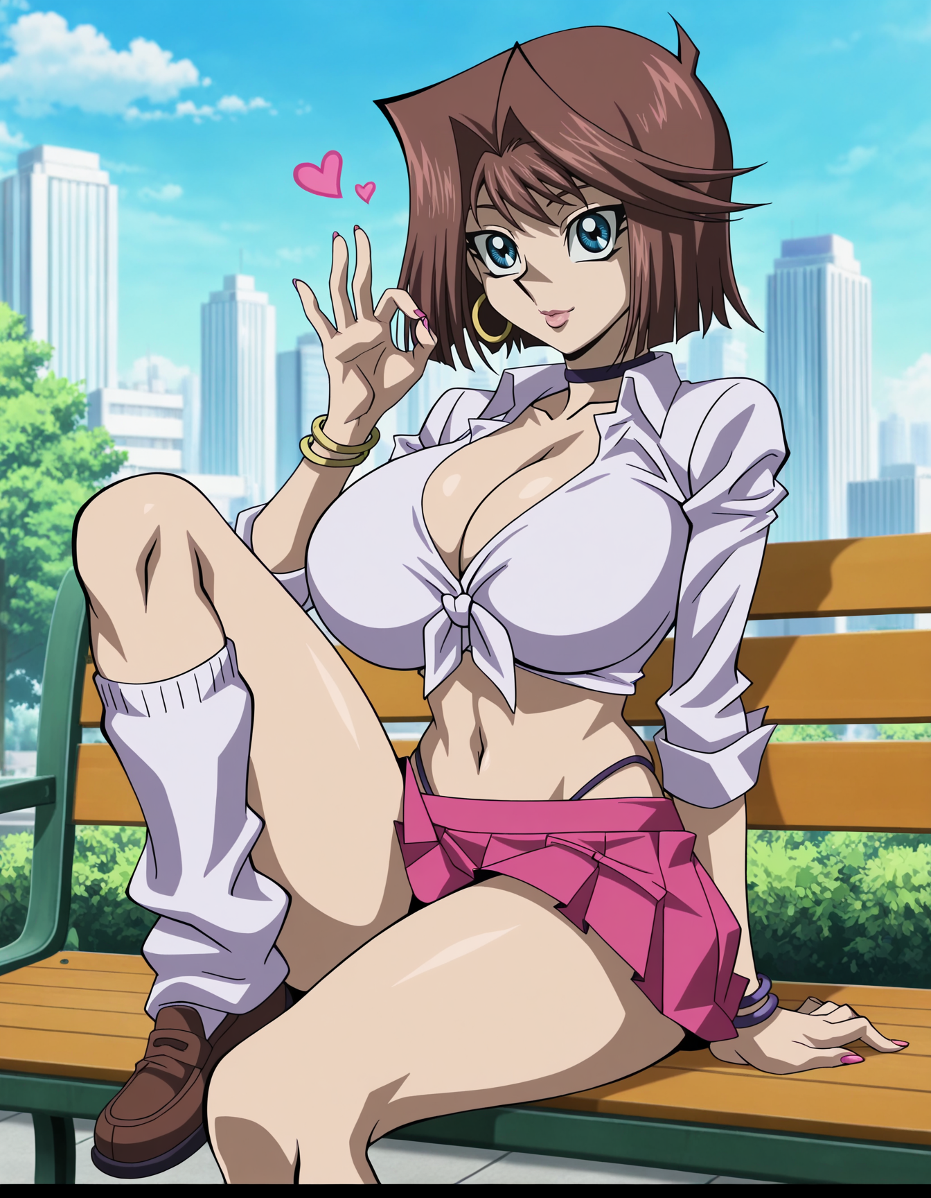 score_9, score_8_up, score_7_up, source_anime, BREAK, uncensored, lora:Anzu\_Mazaki:1, brown hair, short hair, blue eyes, large breasts, looking at viewer, 1girl, solo, curvy, voluptuous