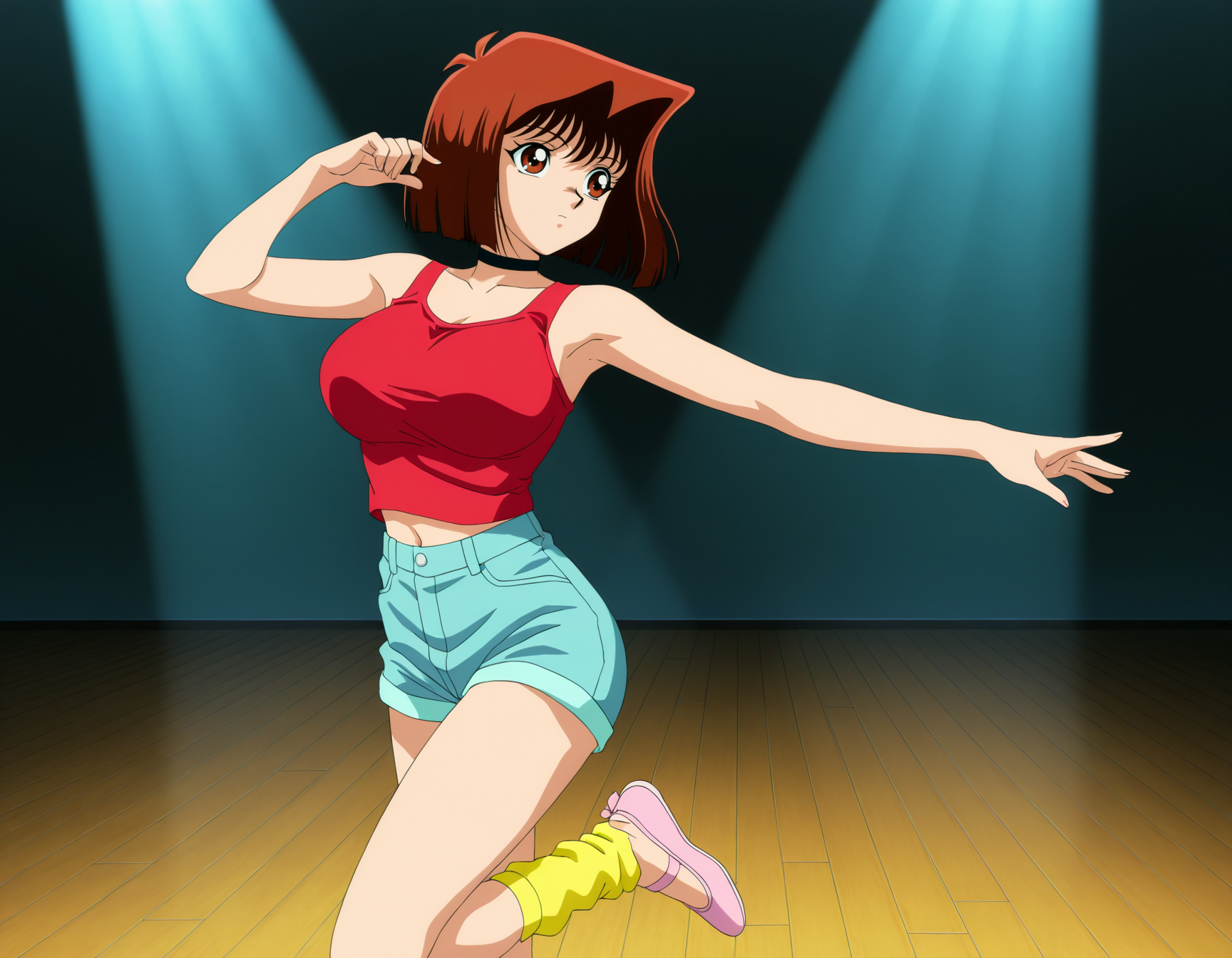배틀 시티: 파란색과 핑크색 팔찌, 네 개의 팔찌, 노랑색 어깨 없는 튜브 탑, 핑크색 반바지, 파란색 벨트, 빨간색 플랫폼 샌들, 핑크색 초이, 검은색 허벅지 스타킹, 시선을 향함, 배꼽, 핑크색 자켓, 노랑색 가방