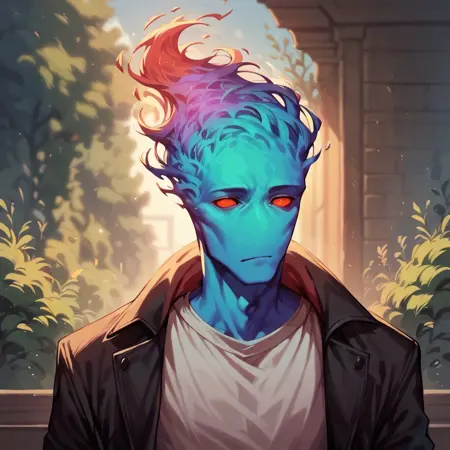 示例提示:firehuman,fiery body,blue tips,1girl,red body,yellow eyes,