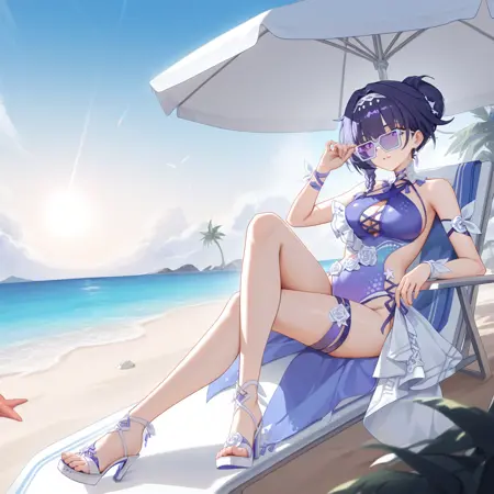 Mei_Swimsuit, 어깨 노출, 파란 비키니, 사롱, 치커, 머리 리본, 배꼽, 선글라스, 가슴 선,