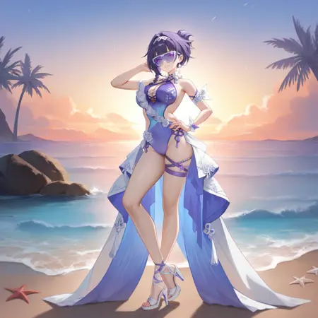 RMei, Fol006, RM_Swm, 레이든 메이, 보라색 머리카락, 보라색 눈, 옆머리 땋기, 머리끈, 프릴 단일 피트니스 수영복, 수영복 스커트, 보라색 수영복, 흰색 장미, 머리띠, 한쪽 귀걸이, 십자형 상의, 십자 끈 옷, 어깨 노출, 옆이 없는 수영복, O링 팔 끈, 손목 리본, 여러 허벅지 끈, 별표, 대체 가린 배꼽, 흰색 샌들, 플랫폼 샌들