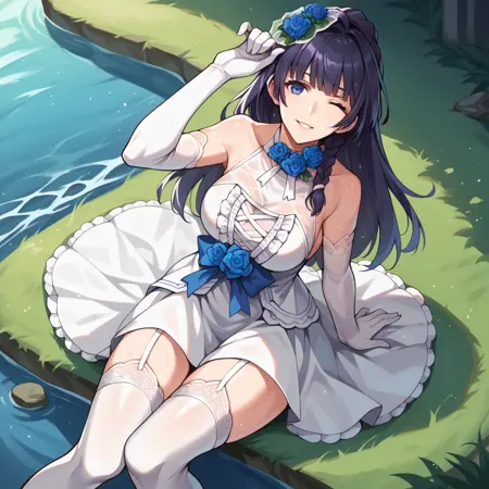 Mei_Wedding, 髪飾り, 濡れたレッグハイズ, ガーターストラップ, ウェディングドレス, おろし, サンクレスドレス, 白い手袋, 肘手袋, 青い花, 青い薔薇,