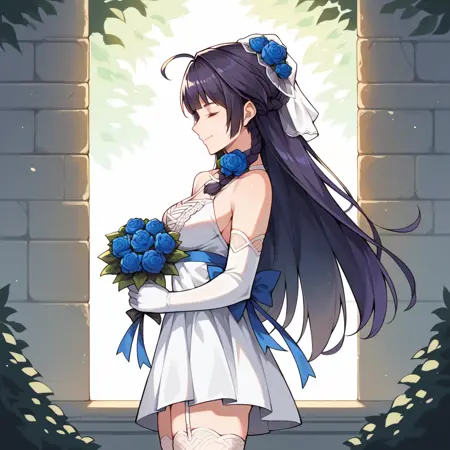 RMei、Fol001、RM_Aep、雷電梅子、紫髪、青目、サイドブレード、青目、ウェディングドレス、白いドレス、ベール、代替胸カバー、白チョーカー、花チョーカー、ストライプリボン、花ヘアオーソーメント、クロスストラップ、青アンダーバスト、青リボン、プリーツスカート、白スカート、青アンダースカート、ガーターひも、ストライプベルト、グローブ、白グローブ、肩露出、代替タイツ、白タイツ、花太ももストラップ、青バラ、