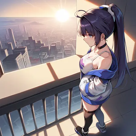 RMei、Fol005、RM_Cyb、雷電梅子、紫髪、紫目、開いたジャケット、紫ジャケット、代替オープンジャケット、代替カーディガン、代替クロスベルト、紫ベルト、サイドスリット、代替片肩露出ミニスカート、代替白スカート、クロスラシングスカート、太ももポーチ、紫パンティーストッキング、片脚パンティーストッキング、代替肩カットアウト、マゼンタ角、代替タートルネック、紫タートルネック、カロップトップ、黒カロップトップ、胸元、スカーフ、紫スカーフ、代替ふわふわロング袖、紫袖、チェック柄、代替スパイクパウルドロン、代替片パウルドロン、紫パウルドロン、黒靴下、片靴下、黒スニーカー、