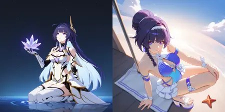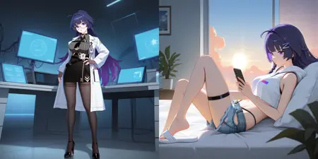(두 복장 모두 머리 스타일이 다르므로 캐릭터 프롬프트에 포함하기 어렵습니다.)