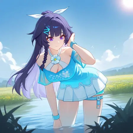 Mei_Swimsuit, 묶인 머리, 보라색 머리, 원피스 수영복, 드레스, 가슴 선, 흰 꽃, 머리 장식, 땋은 머리, 어깨 노출, 귀걸이, 다리, 보석,