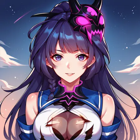 Raiden_Mei, long hair, purple hair, blue eyes, ponytail, braid, raiden mei