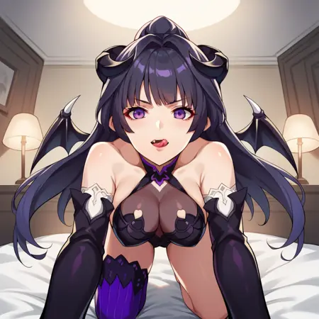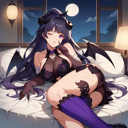Mei_Demon, 黑色紧身衣, 心形开洞, 紫色过膝袜, 单条过膝袜, 全身紧身衣, 侧裙, 吊带式领口, 恶魔翅膀, 恶魔角, 肘部手套, 侧乳, 暴露胸部, 裸露肩膀,