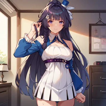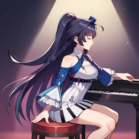 RMei, Fol004, RM_Ulo, raiden mei, purple hair, blue eyes, alternate shrug (clothing), blue shrug, shoulder cutout, white collar, collared shrug, buckle, mini top hat, blue headwear, cleavage, piano print, alt white dress, pleated dress, black underbust, belt, alternate black belt, layered sleeves, frilled sleeves, blue sleeves, alternate white sleeves, alt flower thigh strap, blue flower,