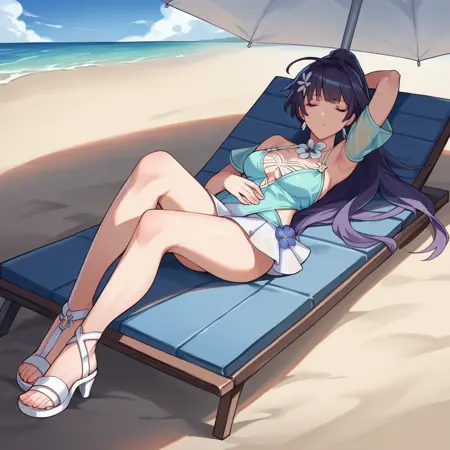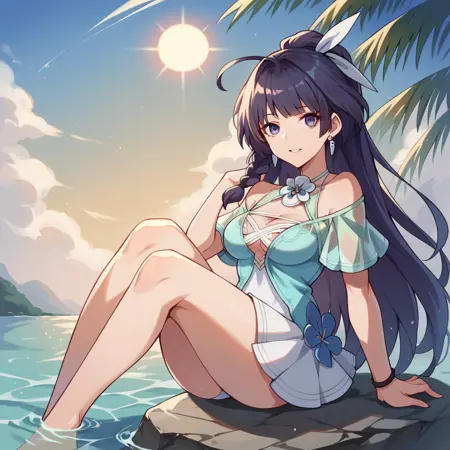 RMei, Fol006, RM_Swm, raiden mei, purple hair, purple eyes, side braid, hair bun, frilled one-piece swimsuit, swimsuit skirt, purple swimsuit, white rose, hairband, single earring, criss-cross top, cross-laced clothes, bare shoulders, sideless swimsuit, o-ring arm strap, wrist ribbon, multiple thigh straps, starfish, alt covered navel, white sandals, platform sandals