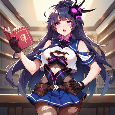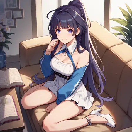 Mei_Origin, 极长发, 马尾, 黑发, 蓝发, 发饰, 过膝袜, 手套, 暴露胸部, 裸露肩膀, 护腕,
