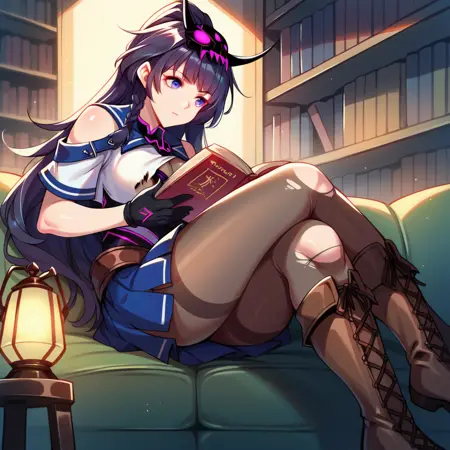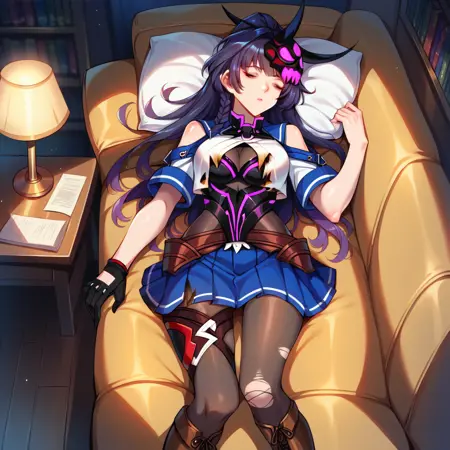 RMei, Fol002, RM_Shd, blue eyes, raiden mei, purple hair, side braid, japanese armor, black armor, alt shoulder armor, black turtleneck, spiked armor, strapless dress, gold stripes, black dress, argyle print, corset, alt black footwear, black corset, red ribbon, red tassel, red sleeves, medium sleeves, alt gloves, alternative black gloves, hair ornament, hair ribbon, turtleneck, single bare shoulder, single sleeve, armband, black wrist guards, alternative thighhighs, red thighhighs, armored boots, alt thigh boots, alt thigh open skirt, black skirt, layered skirt, short pelvic curtain, black pelvic curtain,