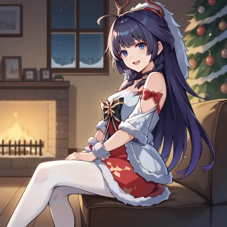 RMei, Fol002, RM_Hon, raiden mei, purple hair, blue eyes, fur-trimmed dress, fur-trimmed sweater, straped dress, shoulder straps, cropped sweater, white sweater, off-shoulder sweater, red dress, fur-trimmed skirt, snowflake, fur-trimmed sleeves, alt white sleeves, fur-trimmed wrist cuffs, alt half gloves, alt red gloves, leather thigh strap, antlers, alt striped bow, black bow, big bow, pantyhose, white pantyhose, red armband, o-ring choker, snowflake earrings, fur-trimmed veil, pom pom (clothes), cleavage, brown footwear, fur-trimmed boots