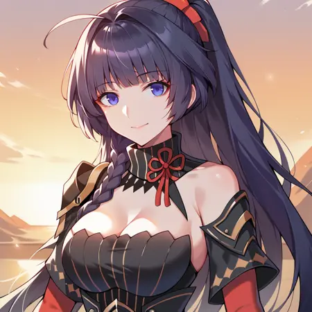 RMei, Fol002, RM_Shd, blue eyes, raiden mei, purple hair, side braid, japanese armor, black armor, alt shoulder armor, black turtleneck, spiked armor, strapless dress, gold stripes, black dress, argyle print, corset, alt black footwear, black corset, red ribbon, red tassel, red sleeves, medium sleeves, alt gloves, alternative black gloves, hair ornament, hair ribbon, turtleneck, single bare shoulder, single sleeve, armband, black wrist guards, alternative thighhighs, red thighhighs, armored boots, alt thigh boots, alt thigh open skirt, black skirt, layered skirt, short pelvic curtain, black pelvic curtain,