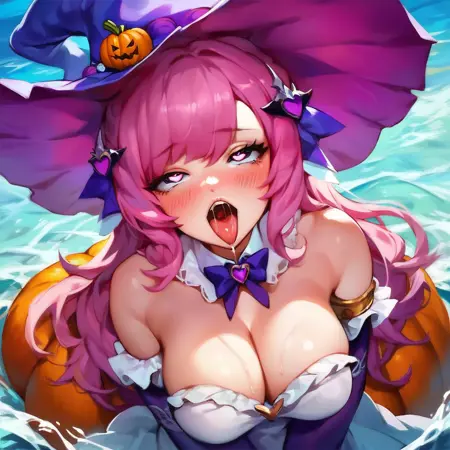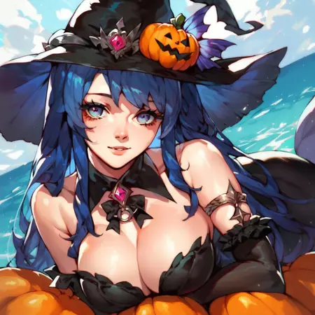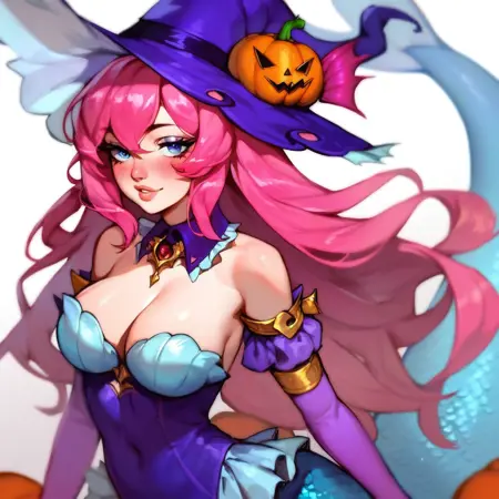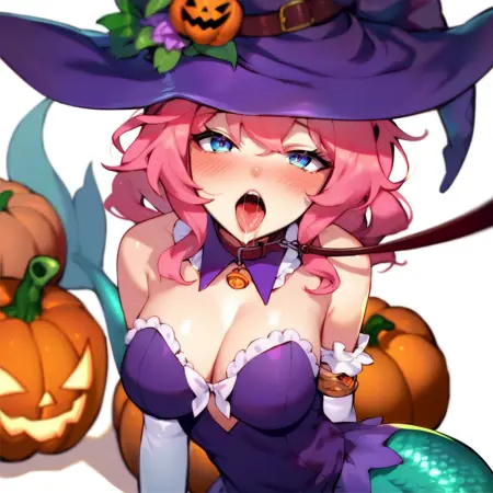 tags: armlet, bare shoulders, breasts, cleavage, detached collar, elbow gloves, eyes, facing away, frills, from behind, from side, full body, holding, long hair, looking at viewer, mermaid, mermaid tail, pumpkin hat ornament, solo, staff, transparent background, witchhat, witchdress