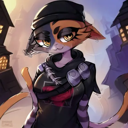 score_9, score_8_up, score_7_up, ultra quality, 1girl, meowskulls, cat girl, anthro, animal ears, beanie, multicolored fur, black fur, orange fur, orange eyes, half-closed eyes, big breasts, printed hoodie, striped sleeves, upper body, hands behind, leaning forward, outdoors, sunny