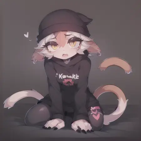 score_9,score_8_up,score_7_up,超高清,1girl,meowskulls,猫娘,人形,动物耳朵,贝雷帽,彩色毛发,黑色毛发,橙色毛发,橙色眼睛,半闭眼睛,大胸部,印花连帽衫,条纹袖子,上半身,双手背后,身体前倾,户外,阳光明媚