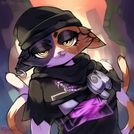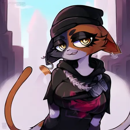 score_9, score_8_up, score_7_up, 超高品質, 1girl, meowskulls, 猫耳少女, 人間的な姿, 動物の耳, ビーニー, 色とりどりの毛, 黒毛, オレンジ毛, オレンジの目, 半眼, 大きな胸, プリントしたスウェット, 斜めのスリーブ, 上半身, 両手を後ろに, 前かがみ, 屋外, 青空