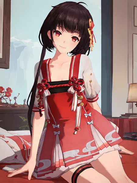 lora:yousa\_ShiYing\_Illustrious\_3:1, yousa,red eyes, hair ornament, ahoge, black hair, bangs,