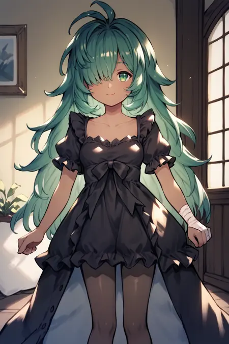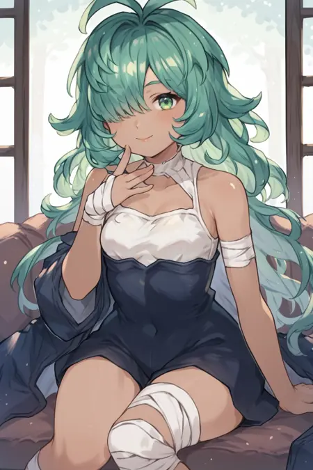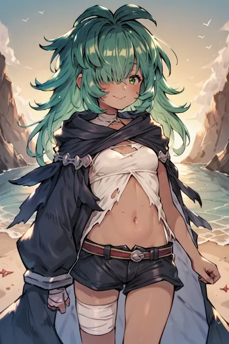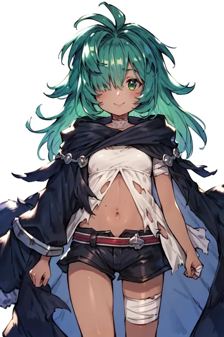 유용한 태그: (진한 피부), 녹색 머리카락, 긴 머리카락, 녹색 눈, 한쪽 눈 위의 머리카락, 붕대, 허리 부분, 망토, 반바지, 찢어진 옷,