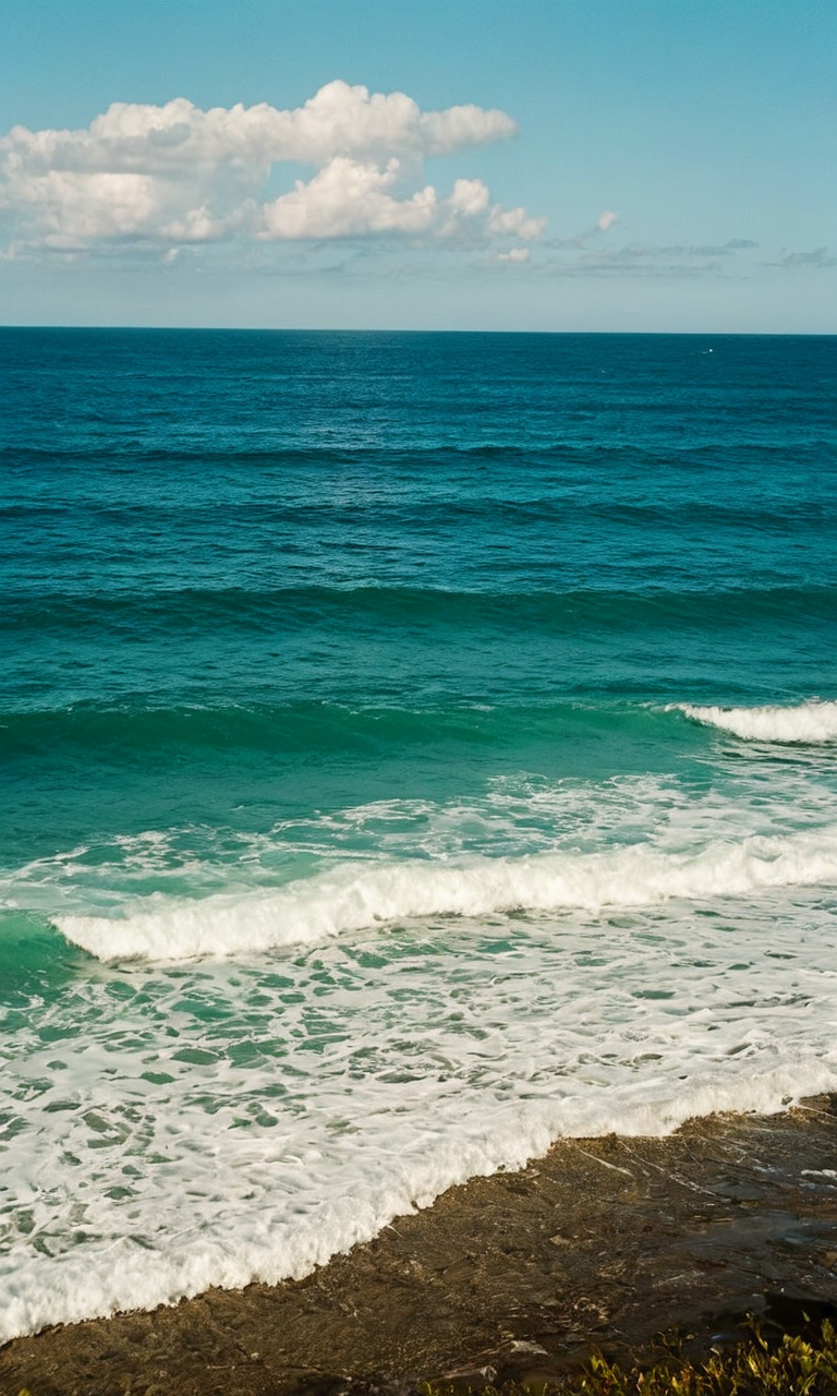아웃도어, 하늘, 낮, 구름, 물, 푸른 하늘, 인물 없음, 바다, 해변, 파도, 해안, 필름, 필름 그레인
