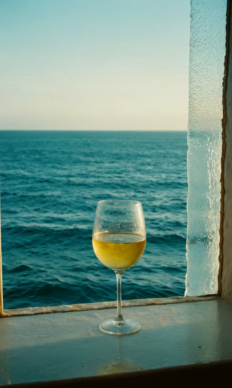 창문, 하늘, 햇빛, 흰 와인 잔 하나, 얼음 조각, 바다, 필름, 필름 그레인, 어두운 분위기