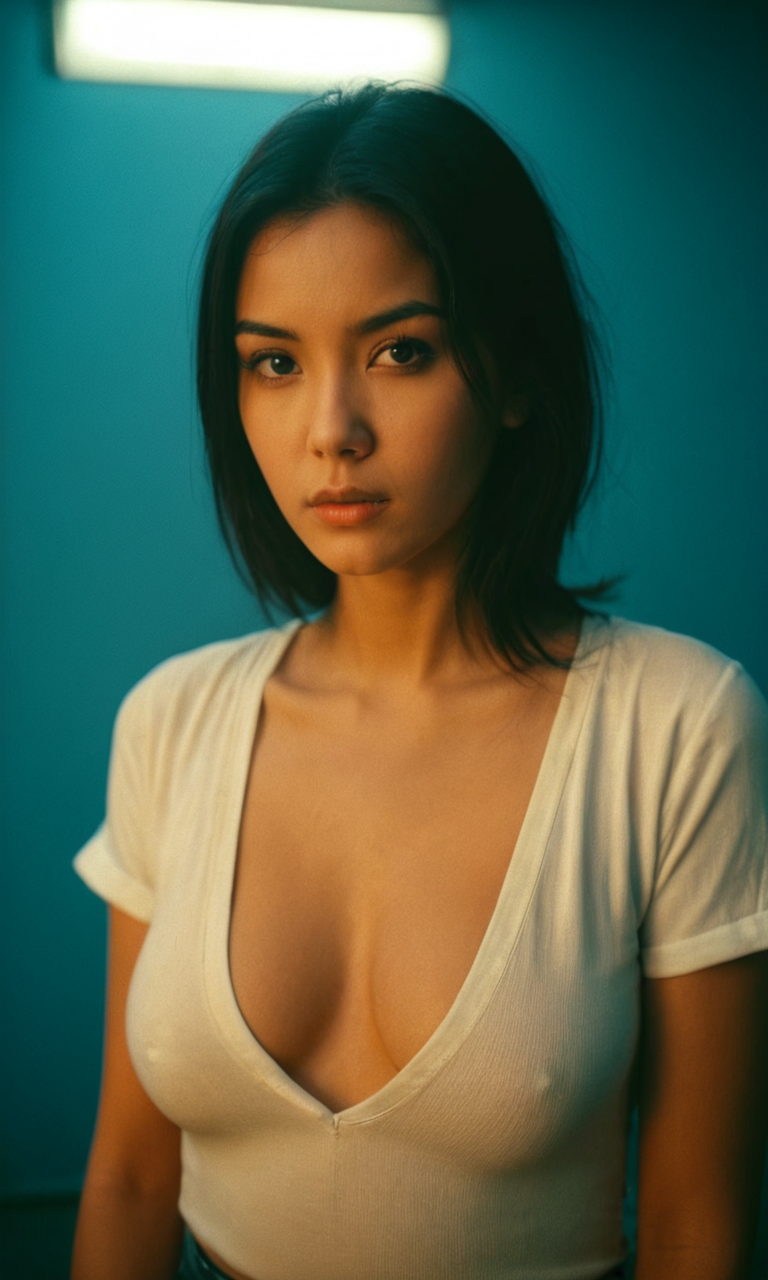 1소녀, 싱글, 시청자 바라보기, 셔츠, 검은 머리, 가슴 노출, 상반신, 필름, 필름 그레인