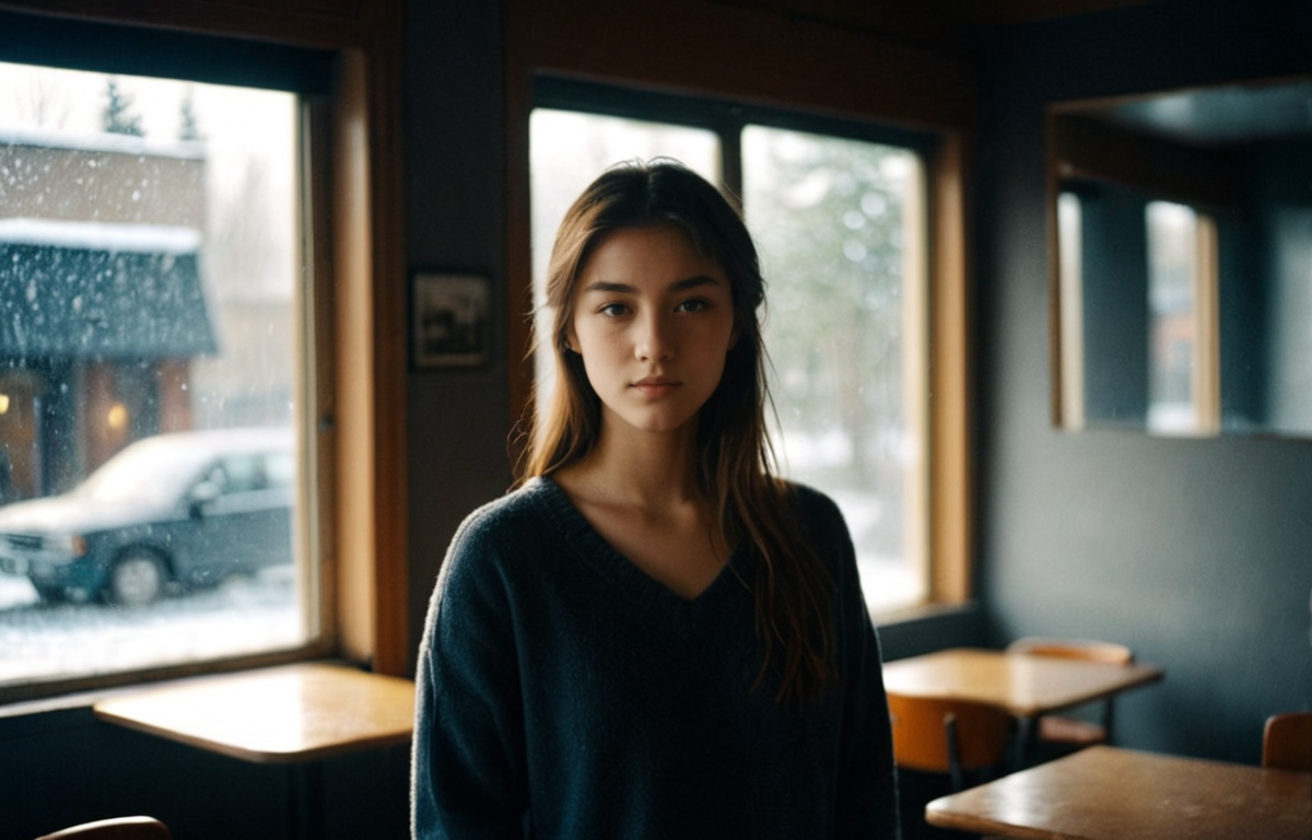 창문을 통해 본 시청자, 커피숍, 간판 조명, 눈 내림, 필름, 필름 그레인, 따뜻한 빛, 와이드 앵글
