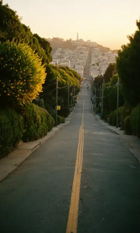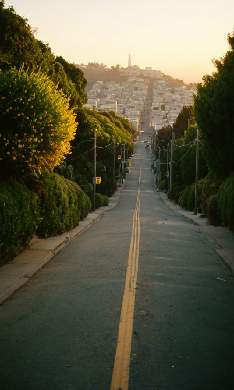 인물 없음, 산프란시스코 아침 거리 풍경, 골든 브릿지, 일출, 따뜻한 빛, 언덕, 측면 시점, 어안 렌즈