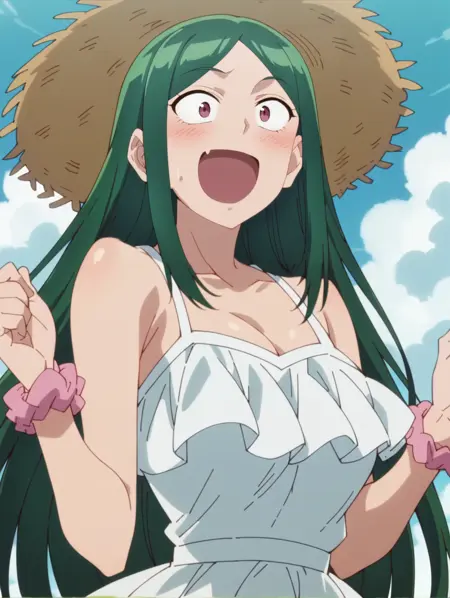 プロンプト: lv1maou、大きな胸、紫の目、長い髪、緑の髪、広い hips、