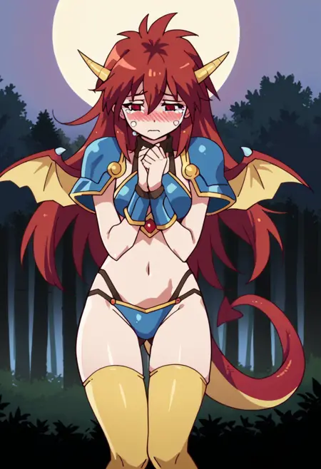 다른 권장 태그: 빨간 머리, 긴 머리, 빨간 눈, 비키니 갑옷, 노란 하의, 꼬리, 날개, 드래곤 뿔, 파란 갑옷