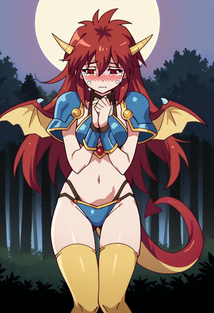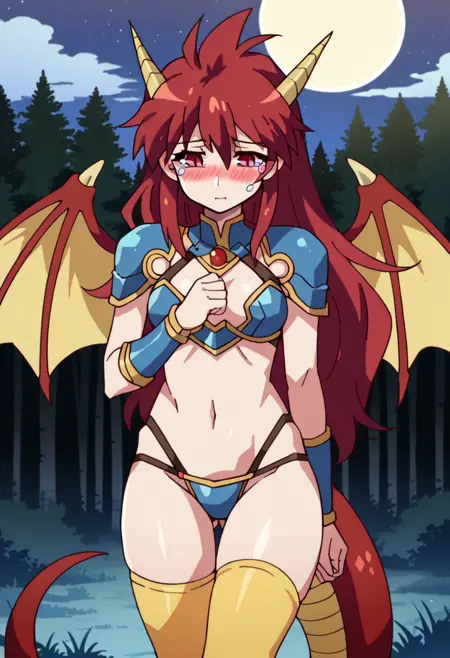 その他の推奨タグ:赤髪、長い髪、赤い目、ビキニアーマー、黄色の脚部装備、尾、翼、ドラゴンの角、青いアーマー