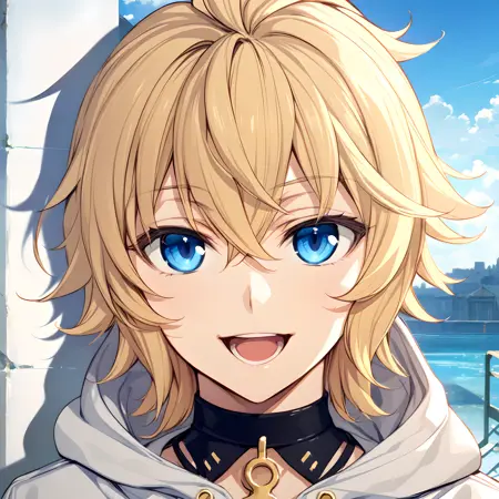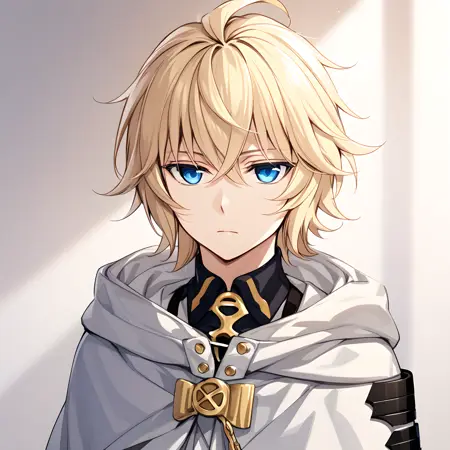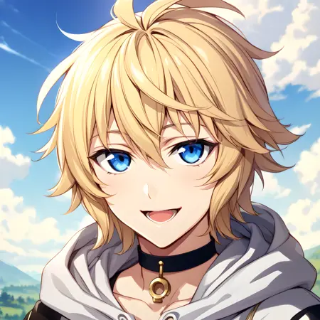 アクティベーションタグは「hyakuya mikaela」。外見は「金髪、青い目、短髪」。代替として「skin fang」タグを追加することも可能。