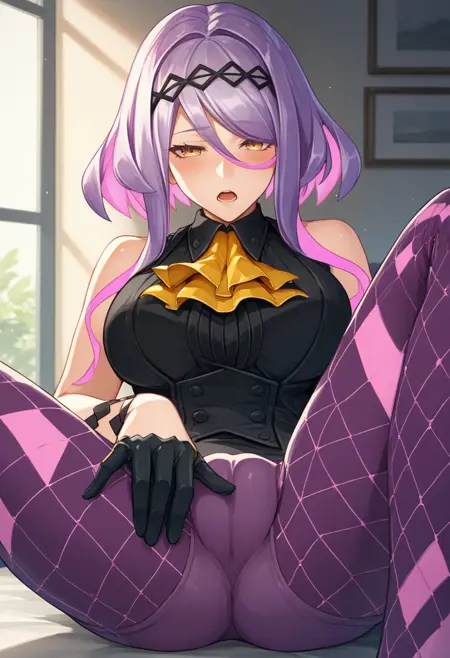默认:figue,黄眼睛,紫发,多色头发,发带,头发位于眼睛之间,侧发,黄色领结,白色外套,长袖,黑色衬衫,半指手套,黑色手套,白色短裤,紫色紧身裤,大胸部