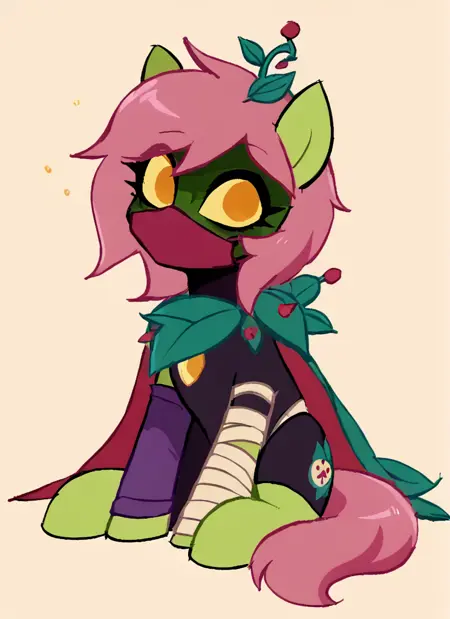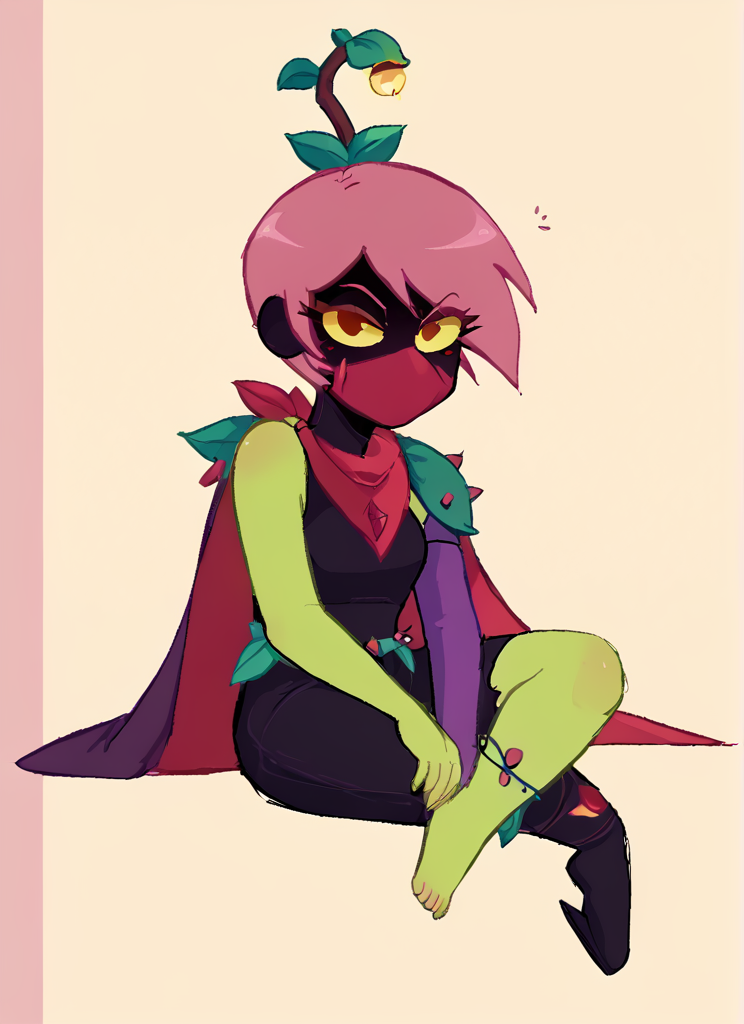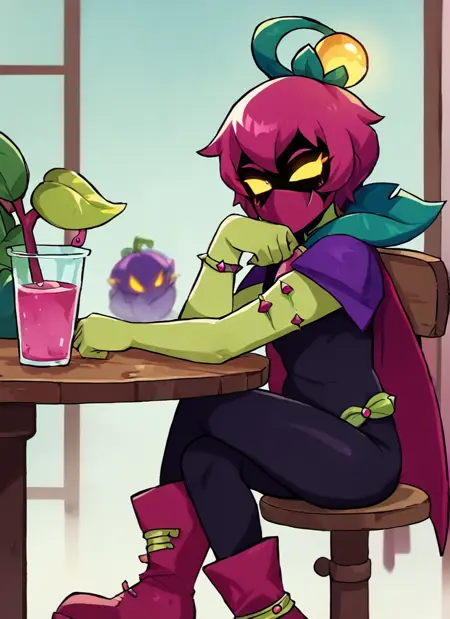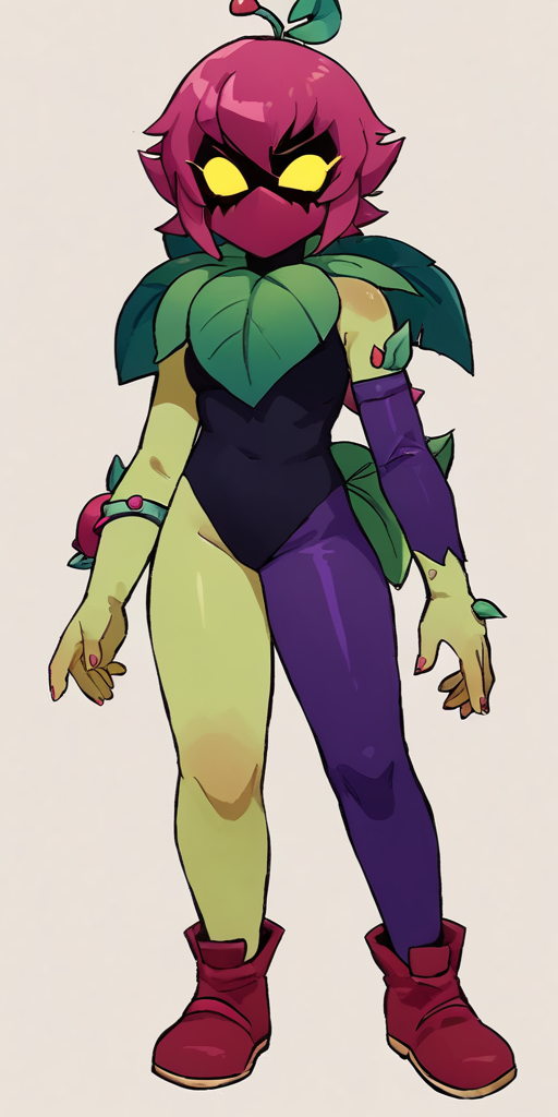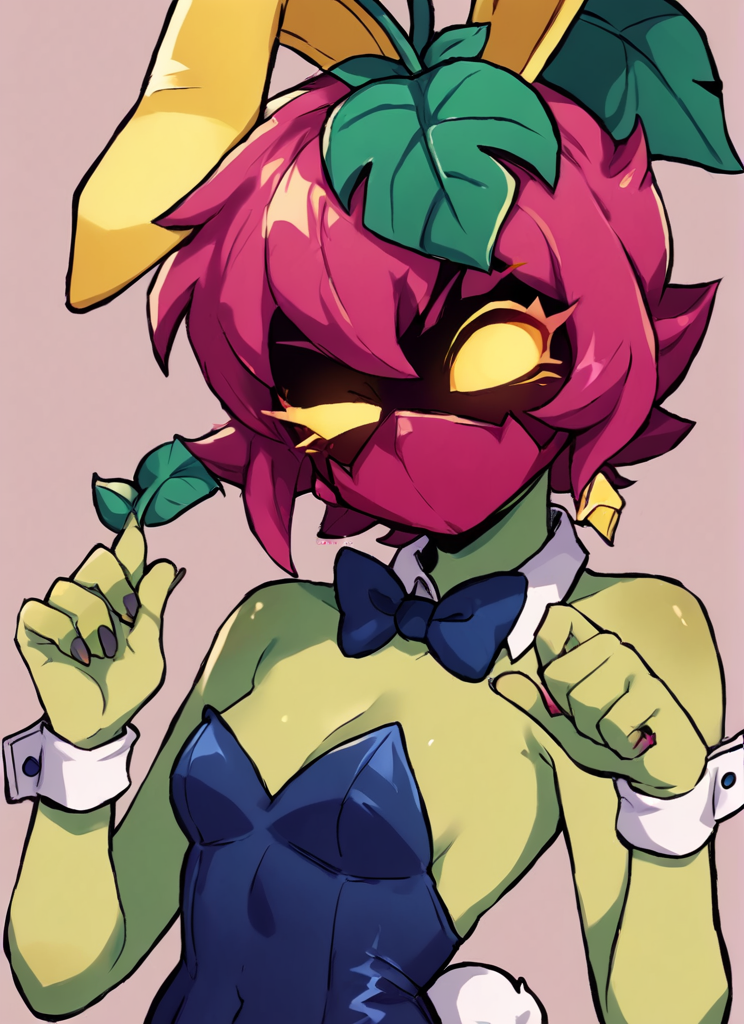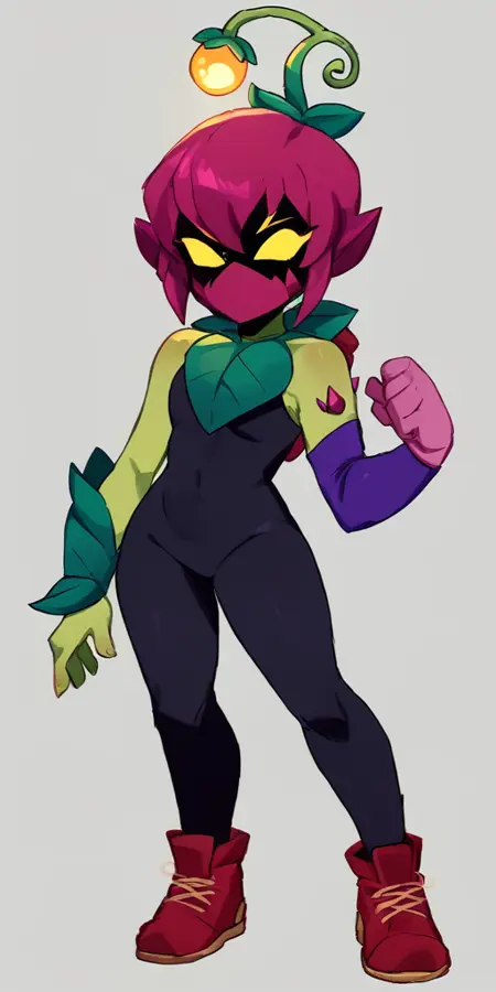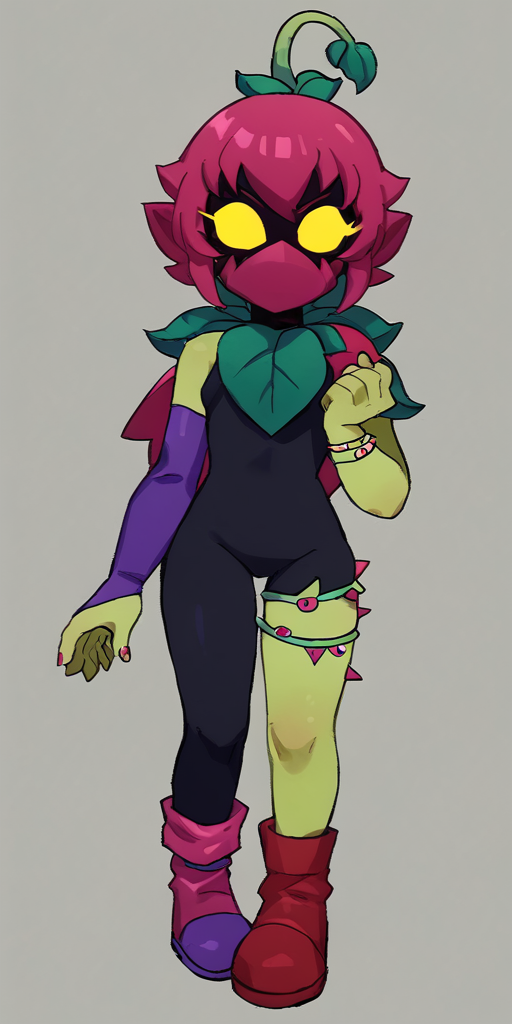 bslily 1girl green skin , yellow eyes, shaded face, no mouth, pink hair , shaded face, ,pink mouth mask, plant gir ,