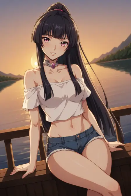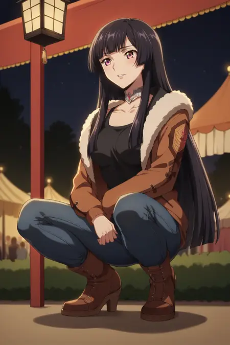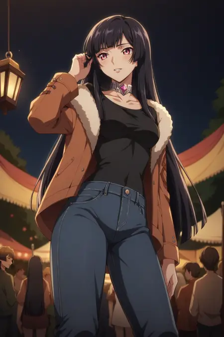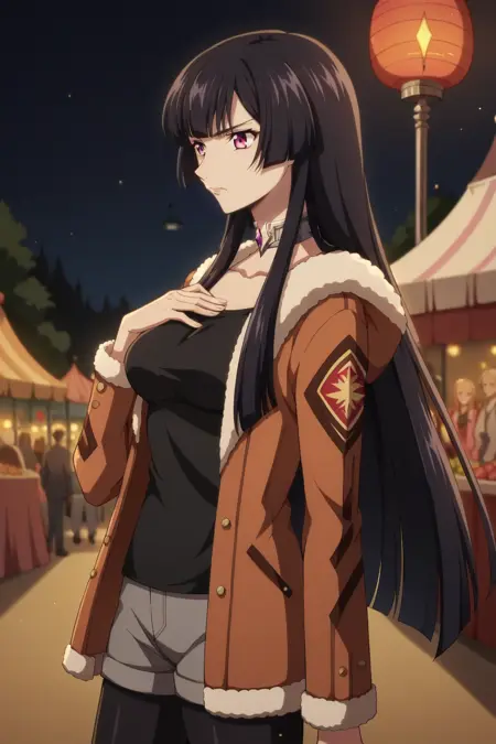 Triggers: black hair, pink eyes, hime cut, long hair, metal choker,